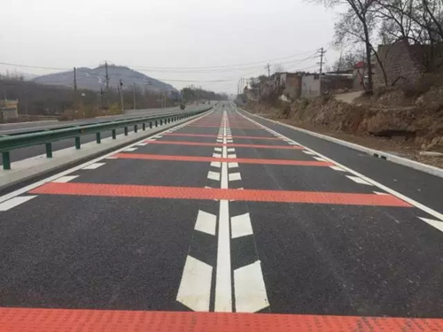 工程路線設計考慮人、車、路、環(huán)境四大要素,體現了以人為本的差異化設計理念。項目優(yōu)化調整了路線指標,沿線除設置縱向振動標線外,橫向還設置了更加醒目的紅色振動標線,既提高了車輛行駛的安全性,又提升了標線視覺上的警示功能。