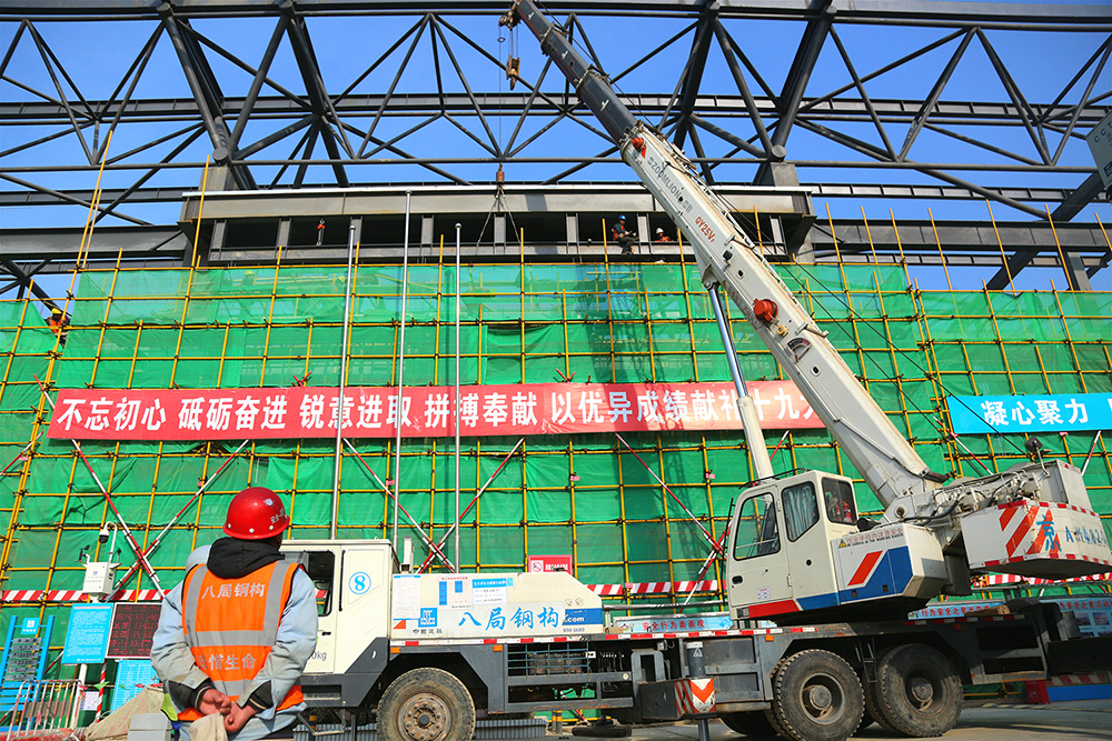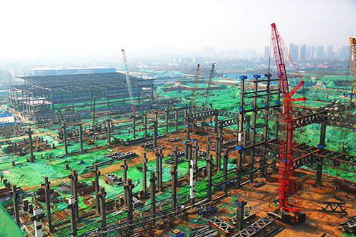 一號(hào)至三號(hào)展館鋼結(jié)構(gòu)吊裝進(jìn)行中