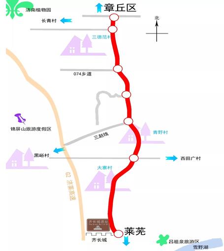 沿線旅游資源豐富,古文化遺跡眾多,直通齊長城、平郭城遺址、錦屏山風景區、呂祖泉旅游區,途徑三德范、西王黑、大寨、田廣等歷史悠久古村鎮,到萊蕪雪野湖景區僅需15分鐘車程。