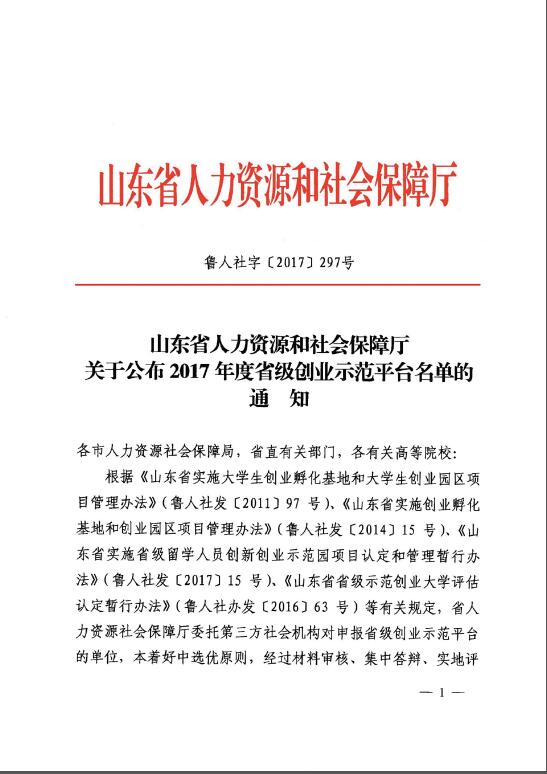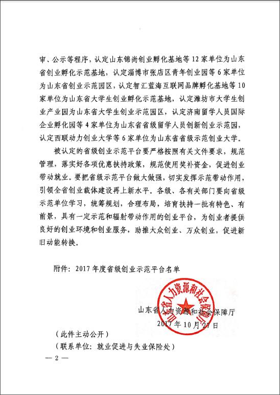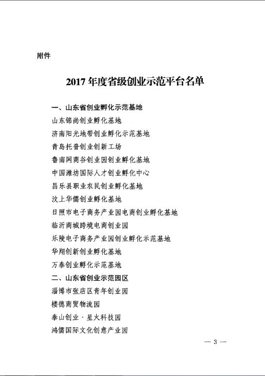 附:山東省人力資源和社會保障廳關于公布2017年度省級創(chuàng)業(yè)示范平臺名單的通知