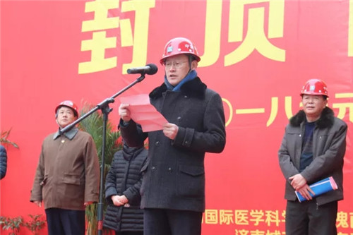 濟(jì)南城市建設(shè)集團(tuán)、濟(jì)南國際醫(yī)學(xué)科學(xué)中心槐蔭區(qū)重點(diǎn)項(xiàng)目指揮部、吳家堡街道辦事處及項(xiàng)目管理單位、審計(jì)、監(jiān)理單位、施工單位的相關(guān)負(fù)責(zé)人和工人代表共同見證項(xiàng)目封頂。