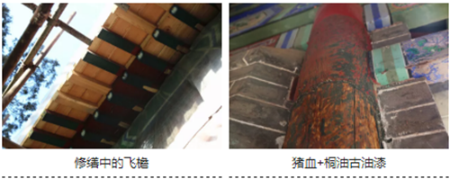 華陽(yáng)宮現(xiàn)存古建多為明清建筑,建筑油漆都是采用“豬血+桐油”的古法油漆,此次修繕過程中,涂刷的新油漆也全部采用該種古法工藝。