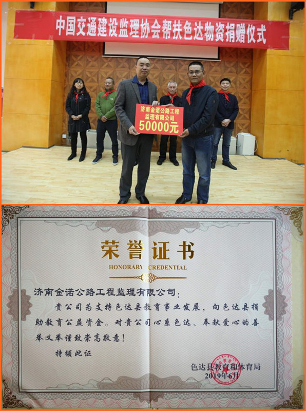 積極參與脫貧攻堅(jiān)事業(yè)是一個有社會責(zé)任感的企業(yè)服務(wù)社會、回報社會的重要體現(xiàn)。不忘初心,牢記使命,濟(jì)南金諾公路工程監(jiān)理有限公司作為中國交通監(jiān)理協(xié)會的理事單位,將持之以恒的為貧困地區(qū)脫貧攻堅(jiān)事業(yè)貢獻(xiàn)力量,持續(xù)關(guān)注色達(dá)孩子的教育和成長,盡企業(yè)的綿薄之力,為社會和諧進(jìn)步和民族團(tuán)結(jié)和諧貢獻(xiàn)力量。