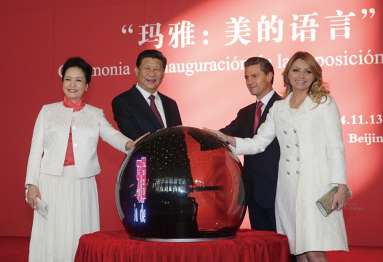 2014年11月13日,國家主席習近平同墨西哥總統培尼亞共同出席在國家博物館舉行的“瑪雅:美的語言”文化展開幕式。這是習近平和夫人彭麗媛與培尼亞夫婦一同為展覽剪彩。新華社記者劉衛兵/攝