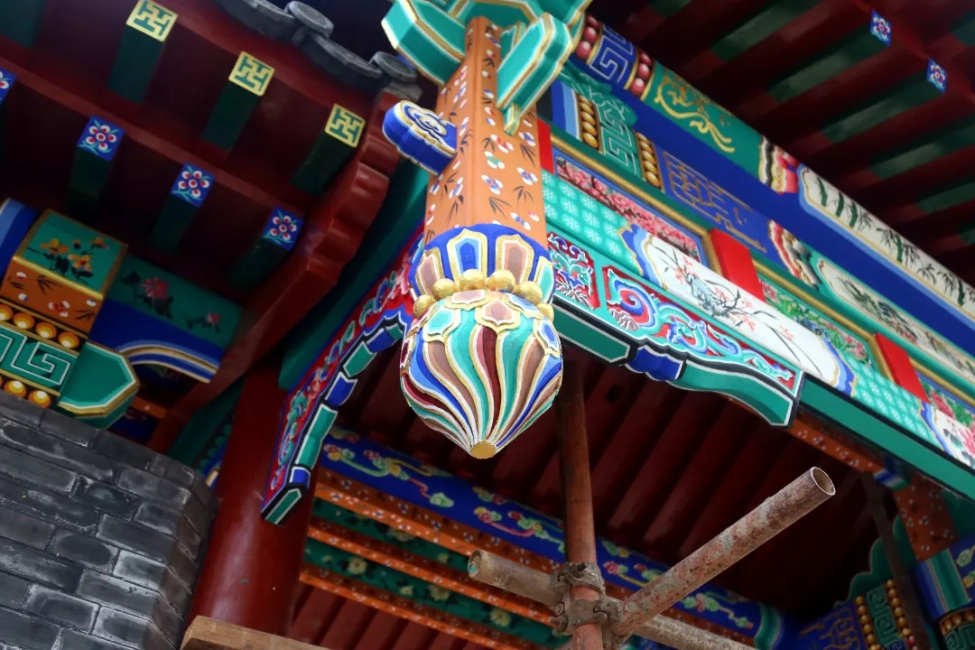老濟南街項目中的建筑物彩繪為清代的官式彩繪,集中裝飾于占地面積最大、院落層次最復雜的“親王府”區域,彩繪具有形象生動、內容豐富的特點,兼具可觀性與實用性,不僅延長建筑物的壽命還可以狀物抒情。此次“親王府”的建筑彩繪工作,由省內資質高、經驗豐富的曲阜市園林古建筑工程有限公司具體負責,本著嚴謹負責的工作態度,遵循建筑清代背景元素,按照建筑物的格局與不同等級制度,組織繪畫經驗豐富的工匠制作。