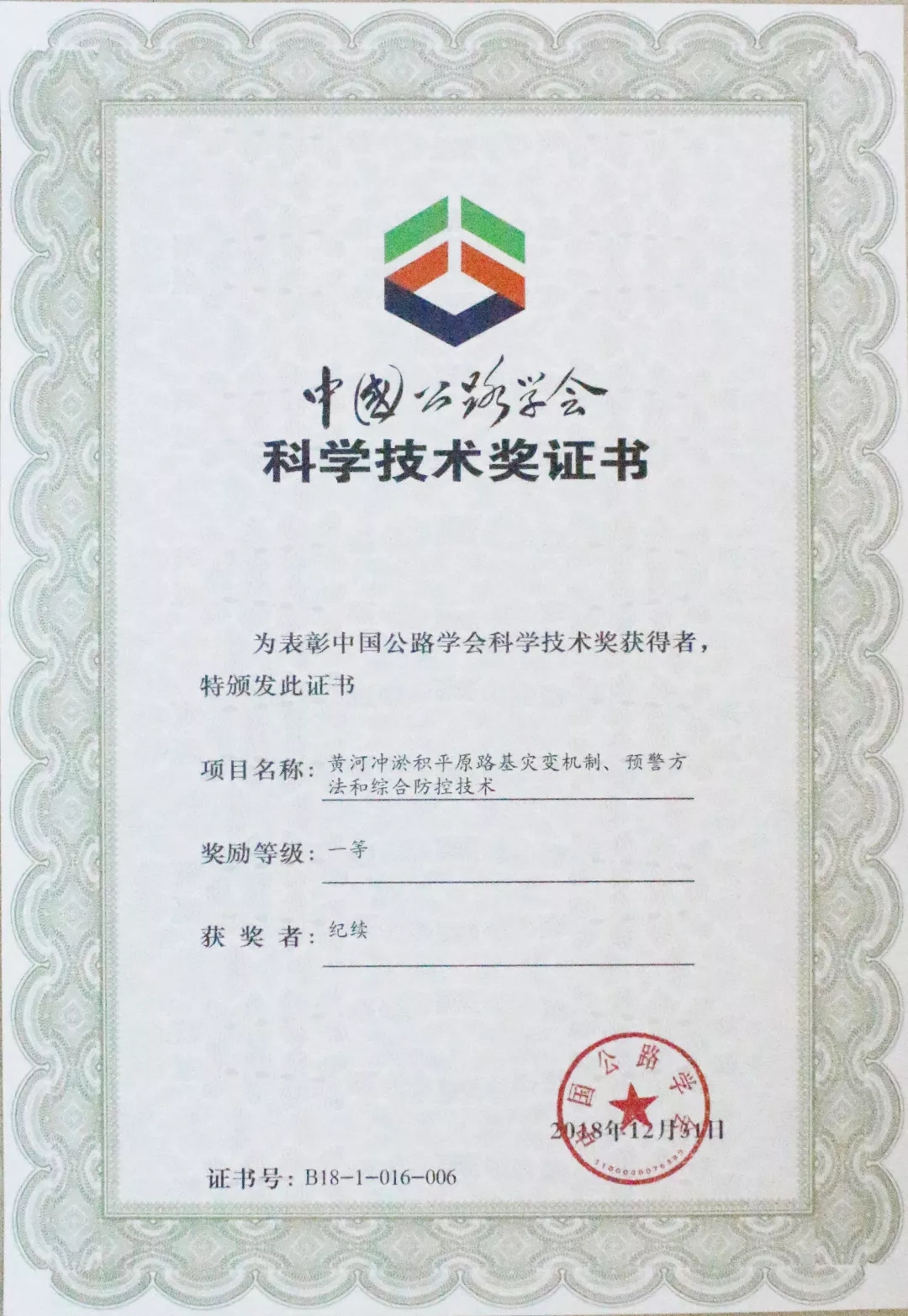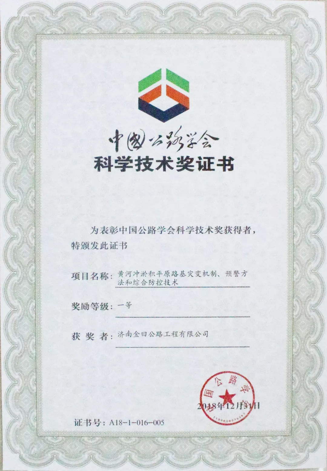2019年6月15日,由中國公路學(xué)會組織的“2018年度中國公路學(xué)會科學(xué)技術(shù)獎頒獎大會”在北京國家會議中心召開。濟(jì)南金曰公路工程有限公司參與研究的課題《黃河沖淤積平原路基災(zāi)變機制、預(yù)警方法和綜合防控技術(shù)》榮獲一等獎。
