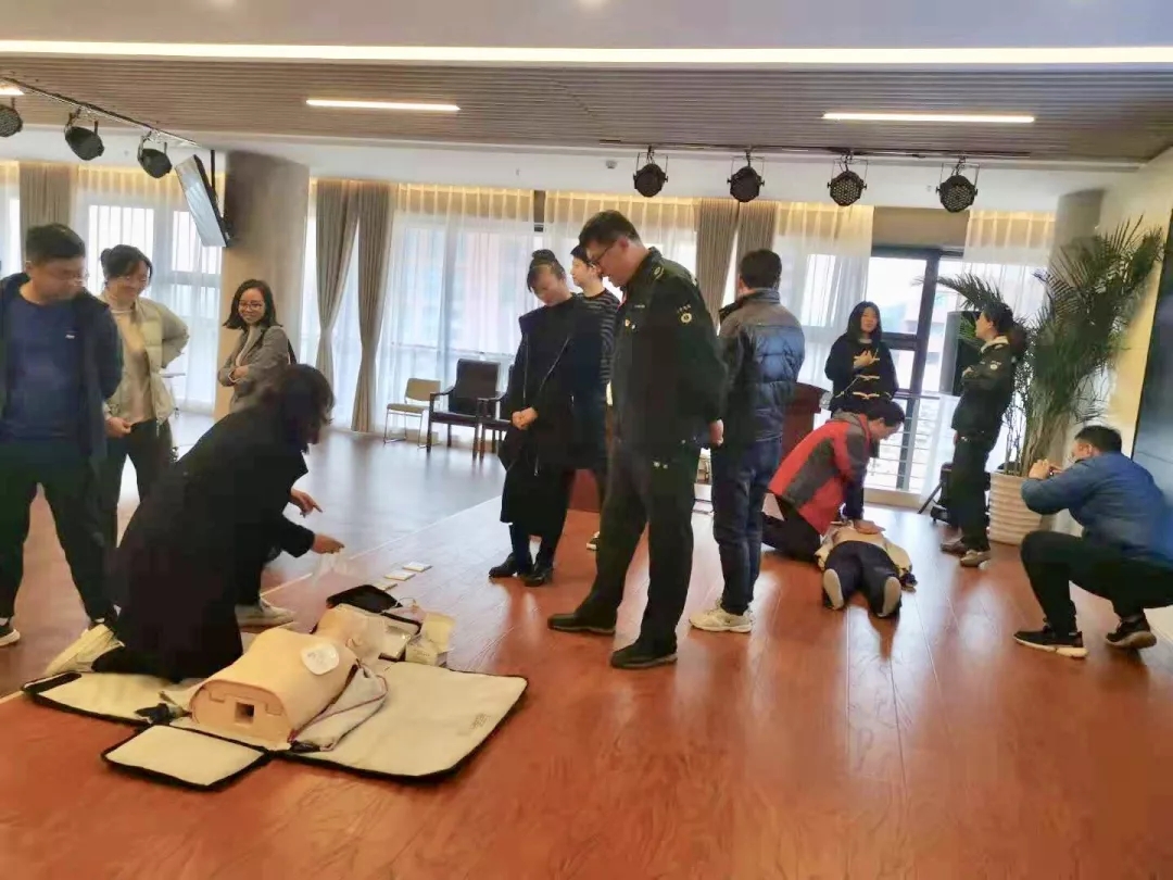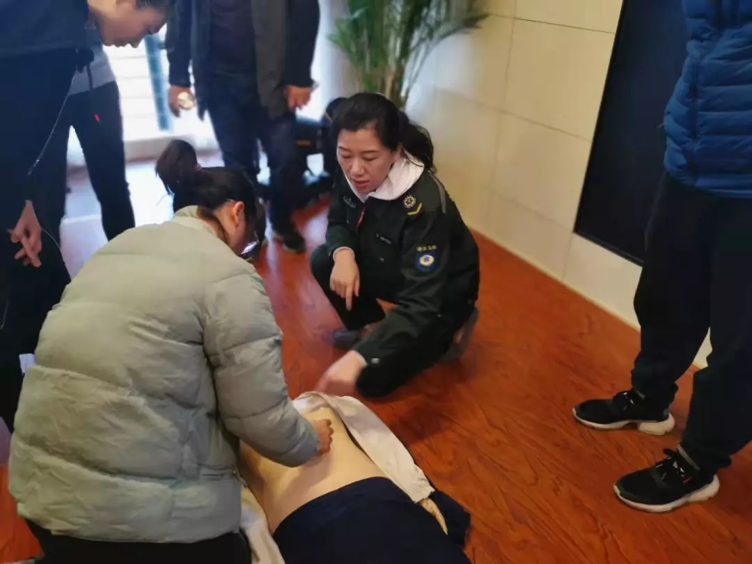 急救中心講師通過參與式的教學方法和圖文、視頻相結合的展現形式,通俗易懂地將深奧的醫學急救知識向在場的學員進行了講解。在系統地學習了基礎知識和急救流程后,通過模擬場景練習了心肺復蘇術、自動體外除顫儀(AED)的使用、外傷止血包扎等操作,培訓導師逐一給予了耐心詳盡的指導。“理論+實踐”的教學模式下學員學習熱情高漲,主動參與實踐中,教學效果良好。