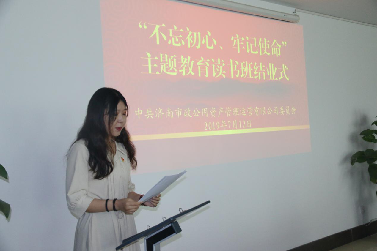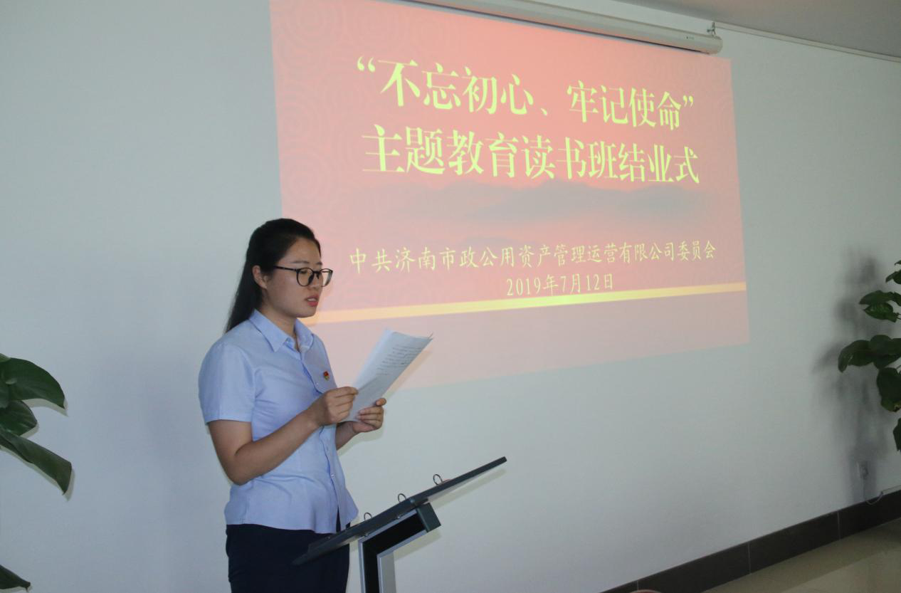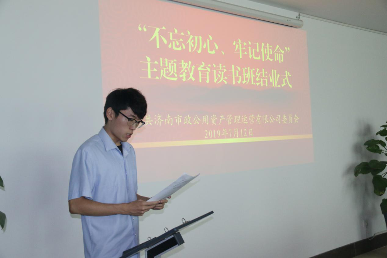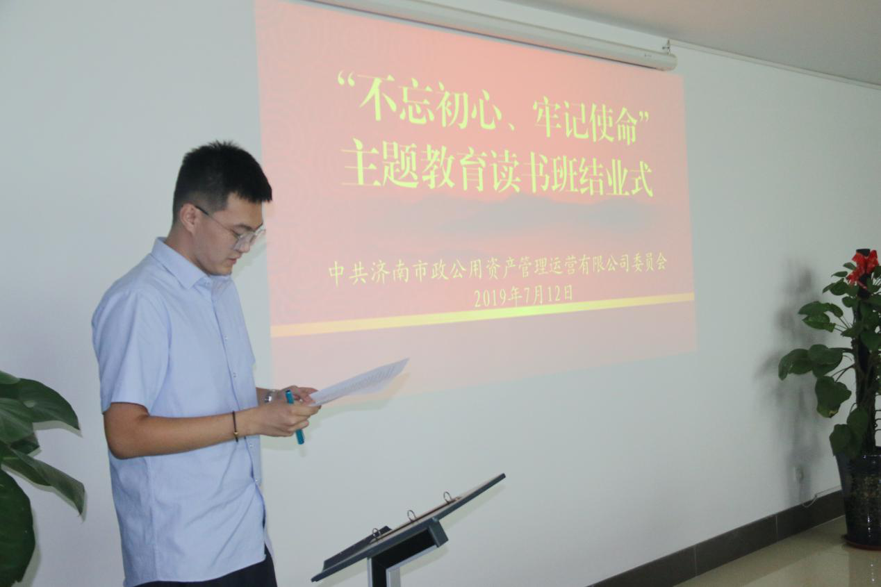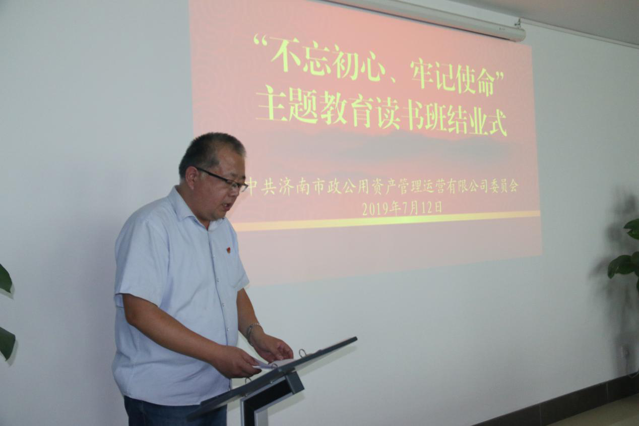根據(jù)中央要求和省委、市委安排部署,按照市委主題教育領(lǐng)導(dǎo)小組辦公室《關(guān)于舉辦第二期“不忘初心、牢記使命”主題教育讀書班的通知》和濟(jì)南城市建設(shè)集團(tuán)黨委要求,7月5日至7月12日期間,濟(jì)南市政公用資產(chǎn)管理運(yùn)營(yíng)有限公司舉辦“不忘初心、牢記使命”主題教育讀書班,并于7月12日上午在公司1066會(huì)議室舉辦結(jié)業(yè)儀式。公司黨委副書記、總經(jīng)理李少成同志出席結(jié)業(yè)式并講話,公司領(lǐng)導(dǎo)班子成員、主管及以上人員、全體黨員參加了此次結(jié)業(yè)式,會(huì)議由公司黨委委員、副總經(jīng)理史德茂同志主持。