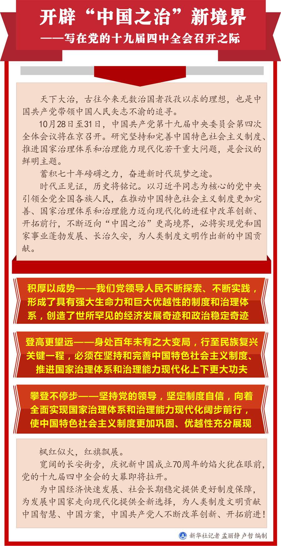 10月28日至31日,中國共產黨第十九屆中央委員會第四次全體會議將在京召開。研究堅持和完善中國特色社會主義制度、推進國家治理體系和治理能力現代化若干重大問題,是會議的鮮明主題。