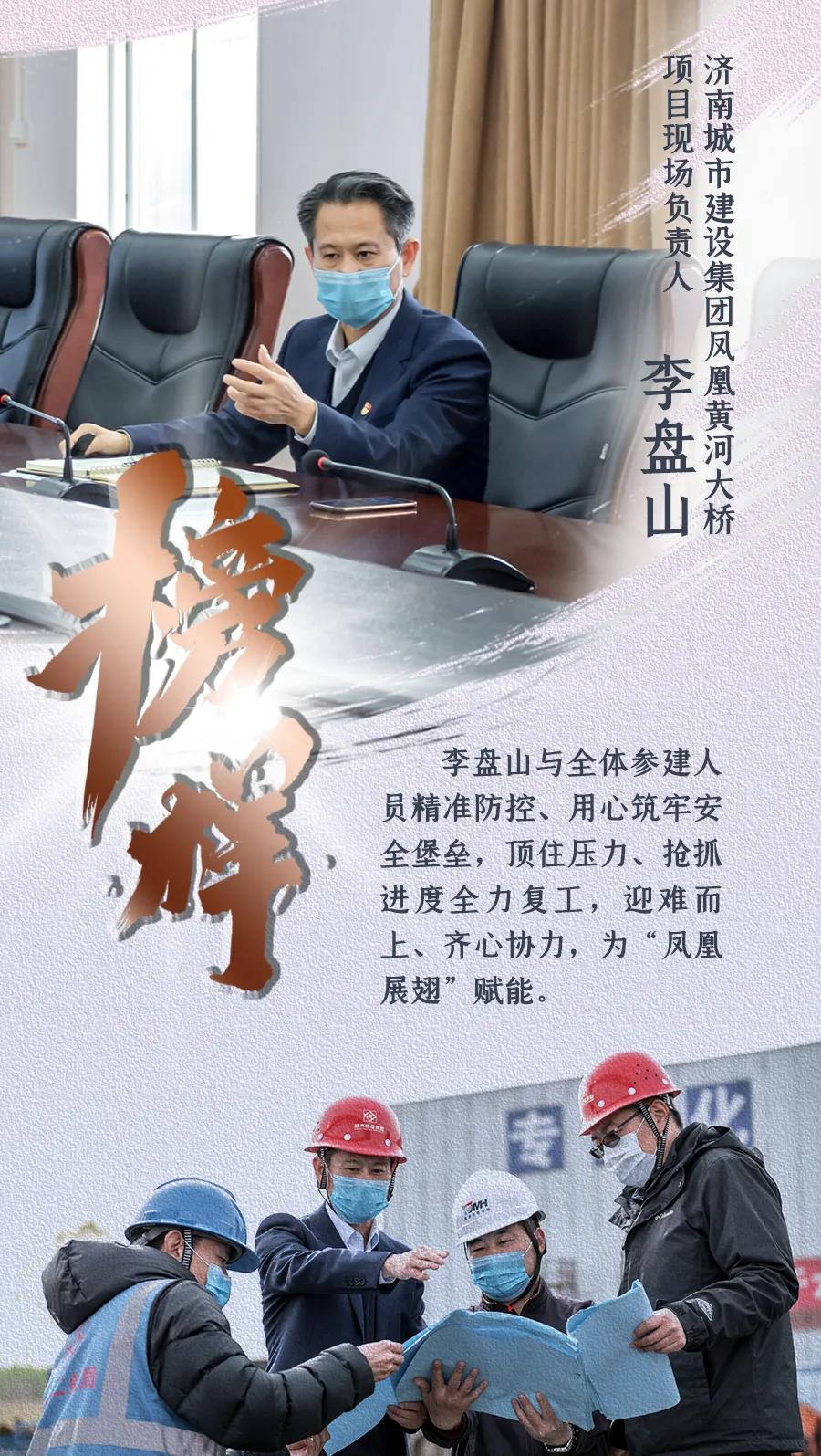 陽春三月,兩岸新綠。鳳凰黃河大橋施工現(xiàn)場,各施工區(qū)域熱火朝天、作業(yè)正忙。自項(xiàng)目全面復(fù)工以來,1000多名工人日夜奮戰(zhàn)一線,在做好疫情防控工作基礎(chǔ)上,項(xiàng)目建設(shè)各項(xiàng)工作全速推進(jìn)。作為濟(jì)南城市建設(shè)集團(tuán)鳳凰黃河大橋項(xiàng)目現(xiàn)場負(fù)責(zé)人,李盤山與全體參建人員精準(zhǔn)防控、用心筑牢安全堡壘,頂住壓力、搶抓進(jìn)度全力復(fù)工,迎難而上、齊心協(xié)力,為“鳳凰展翅”賦能。