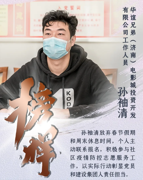 近日,一封來自槐蔭區段店社區居民委員會的感謝信發至濟南城市建設集團,感謝信的“主角”是集團所屬華誼兄弟(濟南)電影城投資開發有限公司的孫袖清同志。新型冠狀病毒肺炎疫情發生以來,孫袖清放棄春節假期和周末休息時間,個人主動聯系報名,積極參與社區疫情防控志愿服務工作,以實際行動彰顯黨員和建設集團人責任擔當,用無私奉獻展現一名“80后”的青春力量,與社區工作人員共同筑牢社區疫情防控安全線。