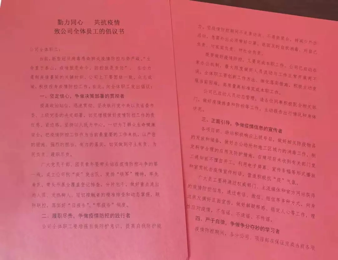 公司黨支部、團支部向公司全體職工發(fā)出倡議,爭做決策部署的貫徹者、疫情防控的踐行者、疫情信息的宣傳者、時間管理的學習者,勠力同心,共抗疫情!