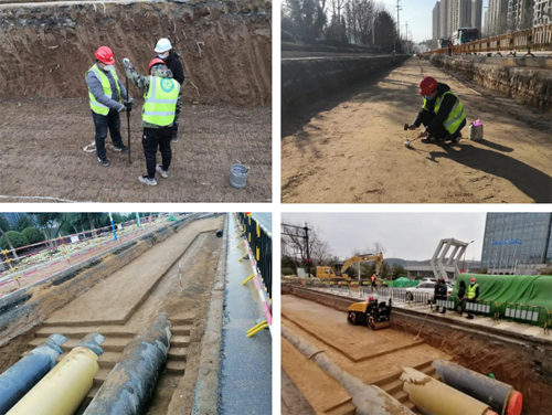 超前策劃,優(yōu)化方案,保證施工有序推進(jìn)。“工期緊、任務(wù)重”是本工程最大的特點(diǎn),各種新建管線約20公里,管線安裝工期僅有40天。按照最初的設(shè)計(jì)方案,各管線位置分散在快車道、人行道、綠化帶等不同的區(qū)域,施工區(qū)域大,管線高程沖突、干擾明顯,無法實(shí)現(xiàn)快速、同時(shí)施工,且全線受多處河道、繞城高速、交叉路口及橫穿管線等難度較大節(jié)點(diǎn)制約,不利于后期恢復(fù),也不能滿足施工期間的通行要求。經(jīng)過多次研究重新確定各種管線位置分布,將所有管線集中在一起施工,按照“確保大管徑位置、小管徑上翻”原則,采取“大管線靠南超前施工,小管線靠北跟進(jìn)施工”形成流水作業(yè),保證高效建設(shè)、快速恢復(fù)、按時(shí)通車。工程開工后,各參建分公司迅速行動(dòng),調(diào)集精銳力量和充足資源保證快速施工,3月30日按期完成所有管線安裝,4月15日道路基層全部完成,4月20日附屬工程全部完成。