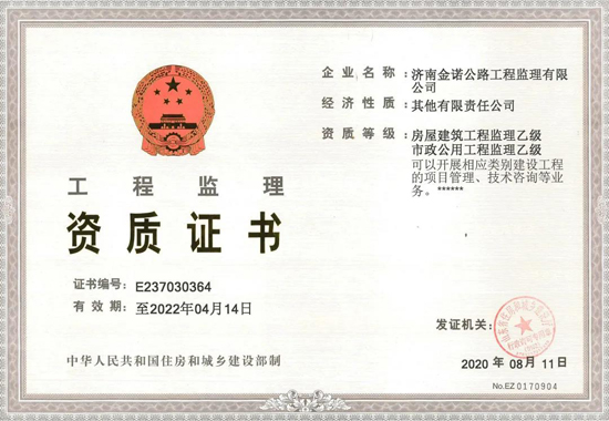 8月11日,經山東省住房和城鄉建設廳批準,濟南金諾公路工程監理有限公司成功取得房屋建筑工程監理乙級資質。