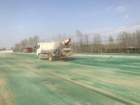 因地制宜,創新揚塵管理。項目部率先引進環保抑塵劑,對易產生揚塵的重點區域進行噴灑抑塵劑和堆料封蓋作業,在短時間內形成保護層,以削減揚塵污染,確保施工區域不起揚塵。