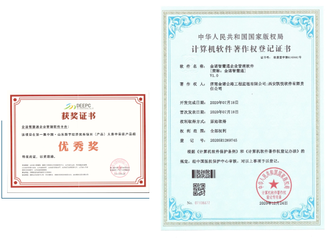 2020年,金諾公司與西安凱悅軟件有限責(zé)任公司合作,研發(fā)了“金諾智慧通”企業(yè)管理軟件,于2020年12月取得中國版權(quán)保護(hù)中心頒發(fā)的軟件著作權(quán)登記證書。“金諾智慧通”參加了第一屆中國(山東)數(shù)字經(jīng)濟(jì)優(yōu)秀項目(產(chǎn)品)大賽,并獲得產(chǎn)品組“優(yōu)秀獎”。同時,2020年下半年推動的針對公路工程建設(shè)開發(fā)的“路面三維剖面破損(病害)自動檢測系統(tǒng)”、“橋梁在線監(jiān)測系統(tǒng)”等8個軟件已申報軟件著作權(quán)登記,軟件著作權(quán)登記證書已于2021年3月份下發(fā)。