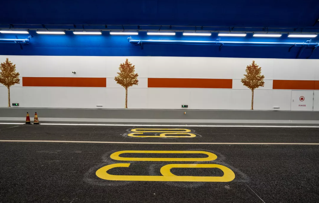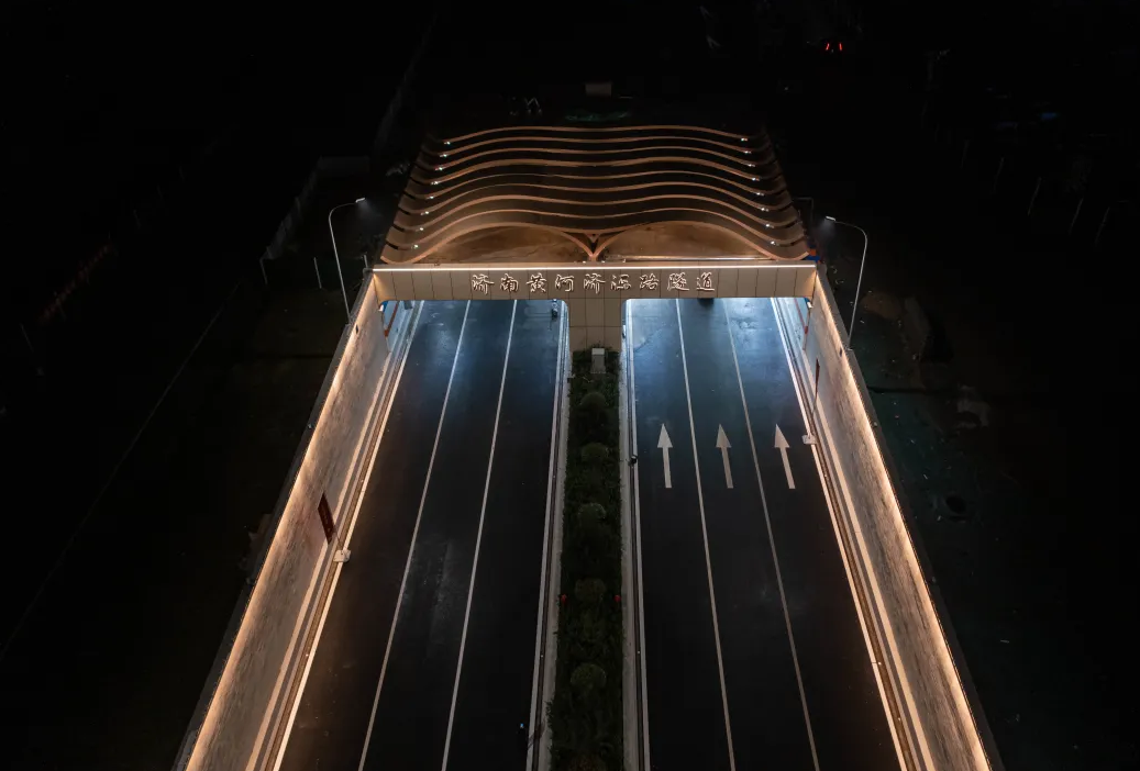 保持隧道主體工程結構不變,通過增加裝飾,實現整體設計提升。隧道南北出口聲屏障以“歲歲九曲彎”和“歲歲安瀾”為設計主題,以中國傳統裝飾紋樣呈現,夜晚還將呈現“日出黃河”的燈光效果。添加“流動”與“水紋”的造型體現了黃河穿越之美,在隧道內采用3D打印貼膜工藝繪制白楊樹(寓意堅韌、表達力求上進的精神),以緩解駕駛員視覺疲勞。同時以黃河星空為題,中間段頂部弧線的燈光表現黃河穿越之感,暖色照明設計表現,感受黃河星空光線流動之美。