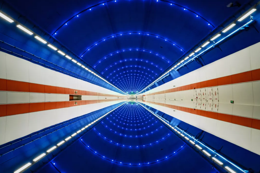 濟南黃河濟濼路隧道設計方案以黃河文化根脈為基,黃河之“光”為“場”,融合黃河歷史、文化、自然、藝術等表現黃河兩岸是我家。“黃河根脈歲歲安瀾”主題設計定位為城河相融,動靜相融,蘊含“天人合一”的設計理念,讓黃河隧道藝術空間景觀和自然互為補充。設計中借黃河水紋傳統紋樣,將黃河文化與自然生態中的場地、色彩、光影結合,再造了黃河地形與黃河流動的自然之美,描繪了新時代黃河畫卷中詩情畫意的城市底蘊。