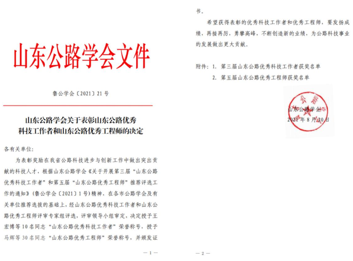 近日,山東公路學會發布了《關于表彰山東公路優秀科技工作者和山東公路優秀工程師的決定》(魯公學會〔2021〕21 號)文件,金宇公司李玉寶同志榮獲“山東公路優秀科技工作者”榮譽稱號,張加華同志榮獲“山東公路優秀工程師”榮譽稱號。