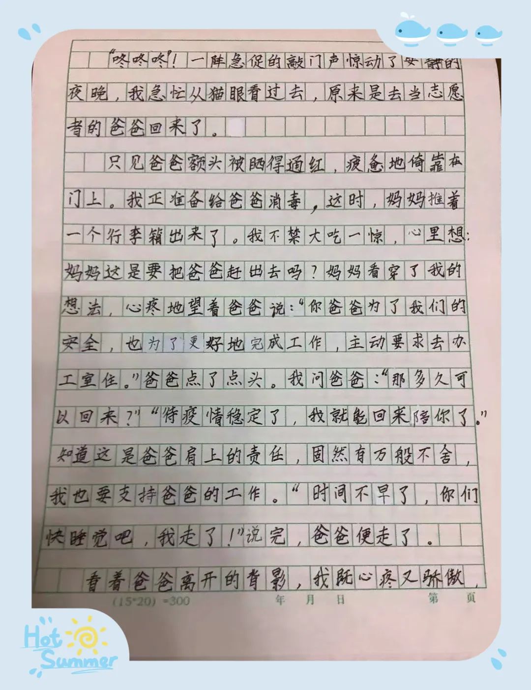 “知道這是爸爸肩上的責任,固然有萬般不舍,我也要支持爸爸的工作”“看著爸爸離開的背影,我既心疼又驕傲,心疼爸爸辛苦工作,但又為有這樣為人民服務的爸爸感到發自內心的驕傲!”這是11歲的榮浩霖小朋友寫的作文“我的爸爸”。
