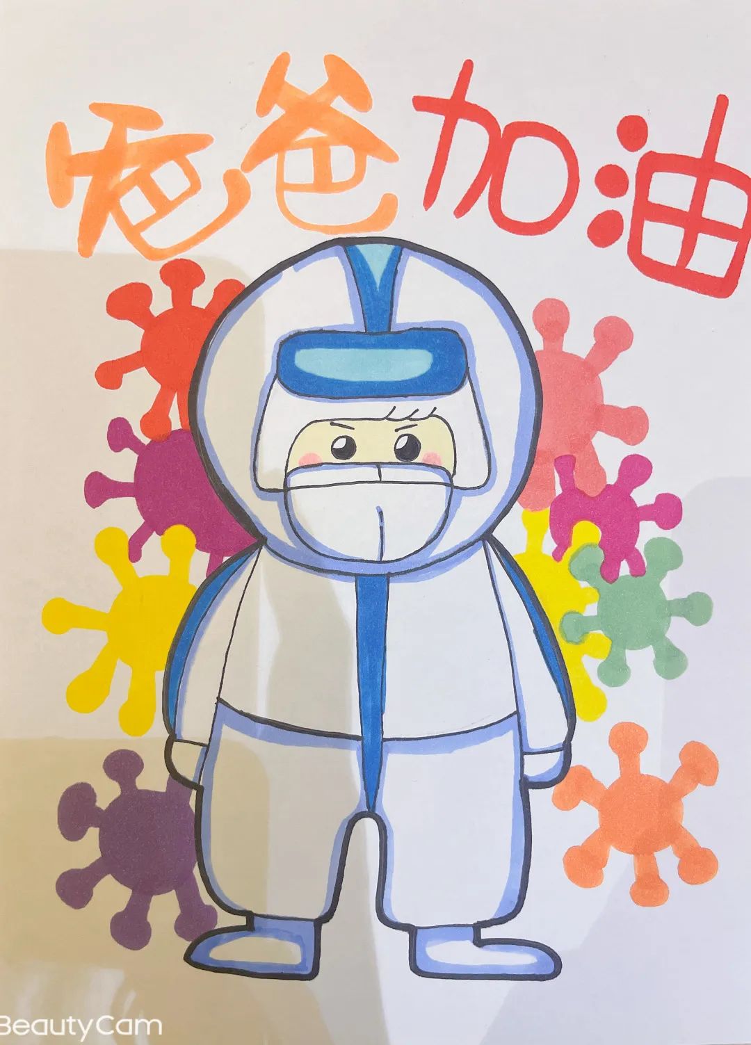 “爸爸加油”!這幅可愛的”大白”卡通畫,出自建設集團所屬濟南城建集團公司下沉南苑社區服務中心的志愿者杜謙12歲女兒之手。一身潔白的防護服,戴著厚實的口罩,只露出一雙炯炯有神目光堅定的大眼睛,這是女兒心中爸爸最帥的形象。