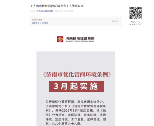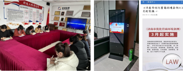 《濟南市優(yōu)化營商環(huán)境條例》(以下簡稱《條例》)于今年3月1日起施行,根據(jù)市國資委《關(guān)于開展優(yōu)化營商環(huán)境法治宣傳月活動的通知》要求,為貫徹實施好《條例》,持續(xù)優(yōu)化營商環(huán)境,3月4日-31日,集團及各子公司積極開展了優(yōu)化營商環(huán)境法治宣傳月活動。活動期間,集團在微信公眾號推送《<濟南市優(yōu)化營商環(huán)境條例>3月起實施》推文,同時通過電子屏投放、制作易拉寶等多種形式進行宣傳,不斷強化干部職工優(yōu)化營商環(huán)境的理念,營造良好輿論氛圍。