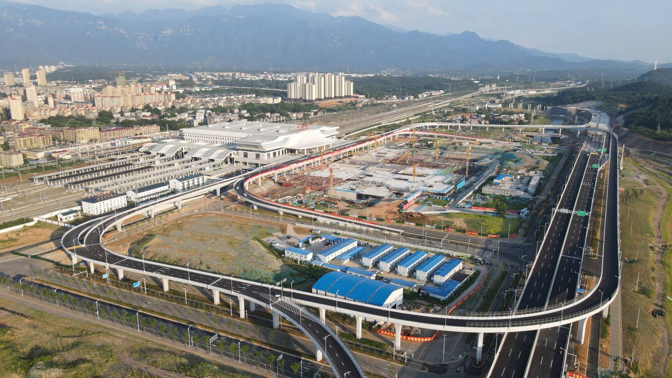 日前,隨著道路橋梁落客平臺段通車,九江高鐵樞紐附屬工程完成全部剩余橋梁施工任務。目前,九江高鐵樞紐結構主體中板完成占比78.6%,頂板完成占比64.3%,廣場回填、坡道、二次結構等同步展開施工。