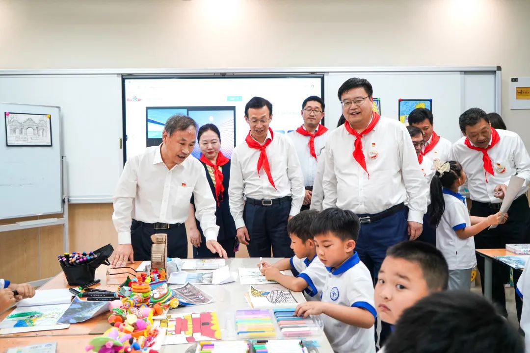 活動結束后,孫常建一行在楊柳春風學校進行了實地參觀調研,了解了書香校園建設活動,并與孩子們進行了親切交流。孩子們熱情洋溢地介紹了“槐蔭少年說”黨團隊一體化品牌建設活動、“我是黃河岸邊好少年”黃河文化項目化學習特色課程、“我眼中的康養名城、活力槐蔭”畫展和手工展、“家住槐蔭‘育’見成長”教育品牌、學校校訓和南北融合辦學理念等情況,并進行了古箏、寫生、經典誦讀等美育教育特色活動表演,美術社團、舞蹈社團、合唱團、足球社團、啦啦隊的成員代表們進行了成果展示。