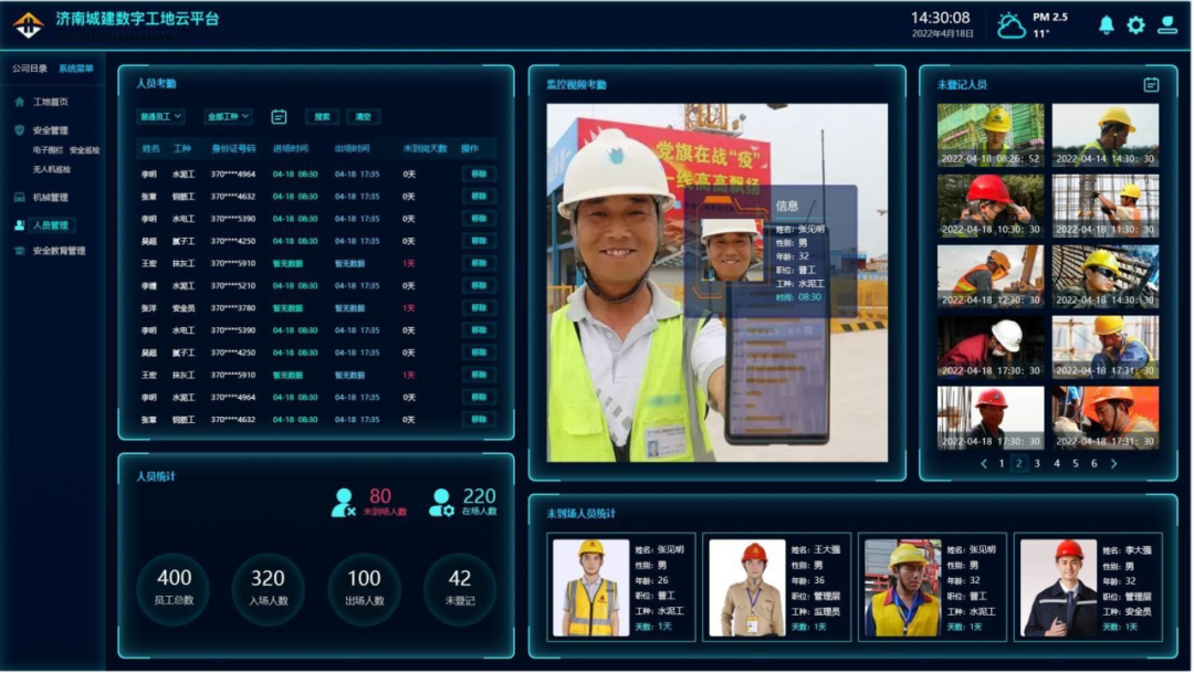 人員管理實現(xiàn)優(yōu)化,G104京嵐線濟南黃河公路大橋擴建工程項目應用智能化勞務人員管理系統(tǒng),系統(tǒng)根據(jù)視頻采樣,可以實時定位,統(tǒng)計當日出勤人數(shù),能夠針對不系安全帶、不正確佩戴安全防護用品,違章動火作業(yè)等進行智能識別,并抓拍報警。系統(tǒng)累計保障工地安全620天,累計錄入工人800余人,攝像頭安裝17個,避免了火災,機械違規(guī)載人,安全用品佩戴不規(guī)范,防護缺失等隱患發(fā)生。