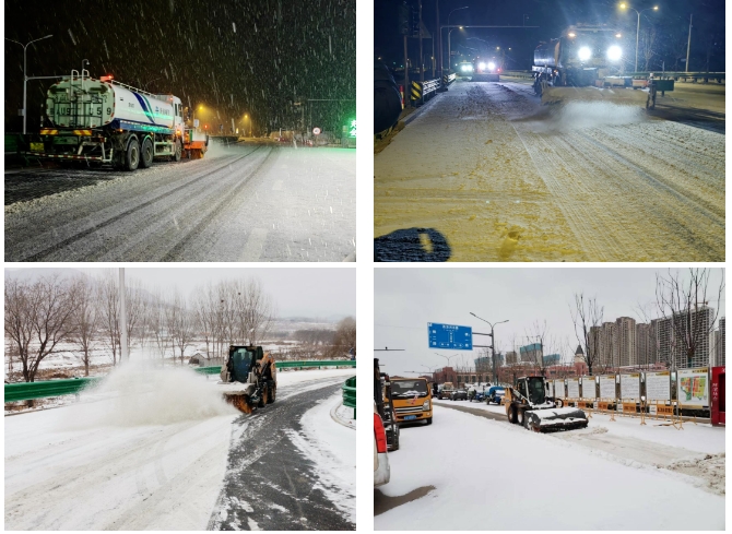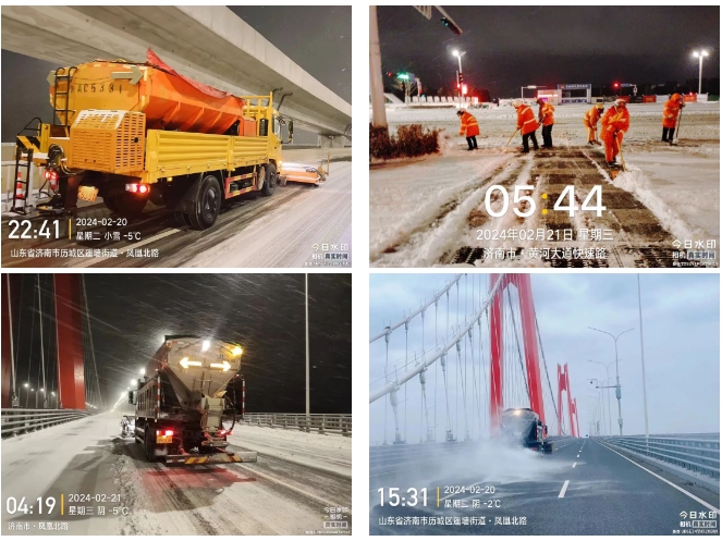 濟南金曰公路工程有限公司承建的國道309、濟南黃河公路大橋、國博城等項目立即啟動應急預案,開啟“機械+人工”的聯動除雪模式,對交叉路口、車輛密集、人員密集等區域進行重點清理,雪中除雪效果顯著。截至目前,共計出動應急隊伍150余人,調配自有和所在轄區街道辦除雪機械設備30余臺(套),撒布融雪劑30余噸。全力保障了重要干線道路通暢,確保了周圍居民的安全通行。