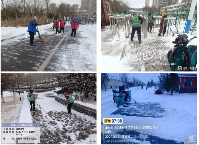 濟南城市建設集團園區管理有限公司提前做出預判并發布相應通知,為惡劣天氣應急管理做好全面準備。華山、濟西濕地、濟南園博園三大景區及時響應、迅速行動,全力組織開展掃雪除冰工作,利用掃雪車、雪鍬、雪鏟等工具,對景區內各出入口、廣場、道路臺階等重點部位進行清雪、清冰工作并鋪設相應防滑措施,保障道路暢通與市民游客安全,最大限度減少低溫雨雪天氣影響。