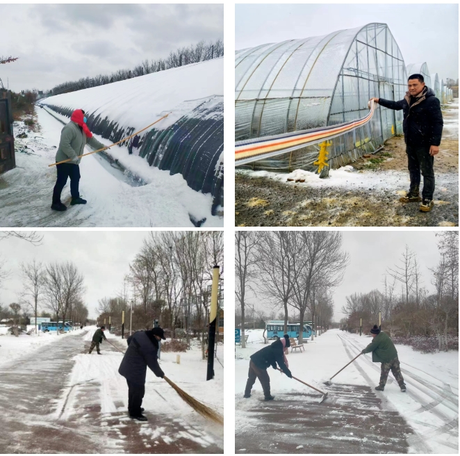 山東濟西濕地生態農場有限公司提前組織人員檢修溫室大棚設施,保證正常運轉,同時,加強棚內保溫,指導租戶及時關閉放風口、防風保溫。加強值守和巡查,做到隨下隨清,尤其注意加強夜間除雪,避免積雪或冰層過厚壓塌棚室,及時清理園內主次干道積雪,確保道路通暢。