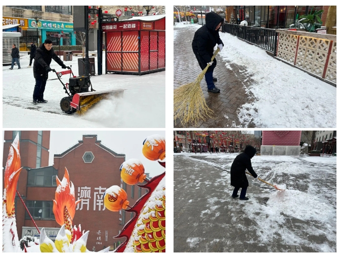 濟南泉世界商業管理有限公司召集物業團隊提前對印象濟南·泉世界進行緊急除雪應對部署。根據特殊天氣情況在商戶群內提前下發溫馨提示,提醒商家大雪天氣地面濕滑、注意出行安全,同時做好相關保障措施。公司督導物業公司提前對除雪設施設備進行保養,備好除雪物資。街區從凌晨開始對商戶門前、主干道及街區內外部道路進行清掃工作,借助掃雪機對主干道進行大清工作,為商戶及游客開辟出暢通安全的道路。