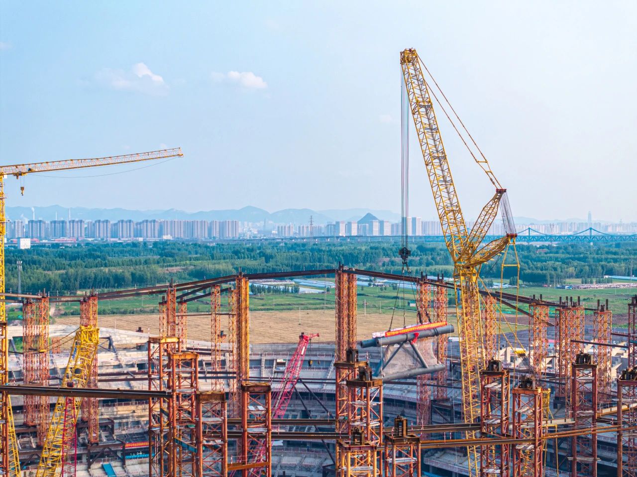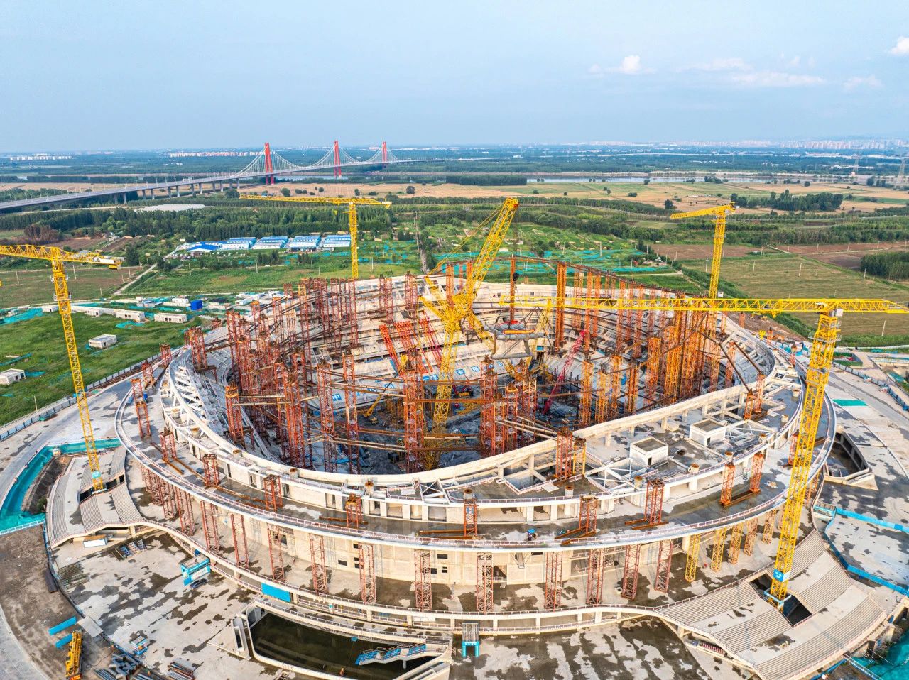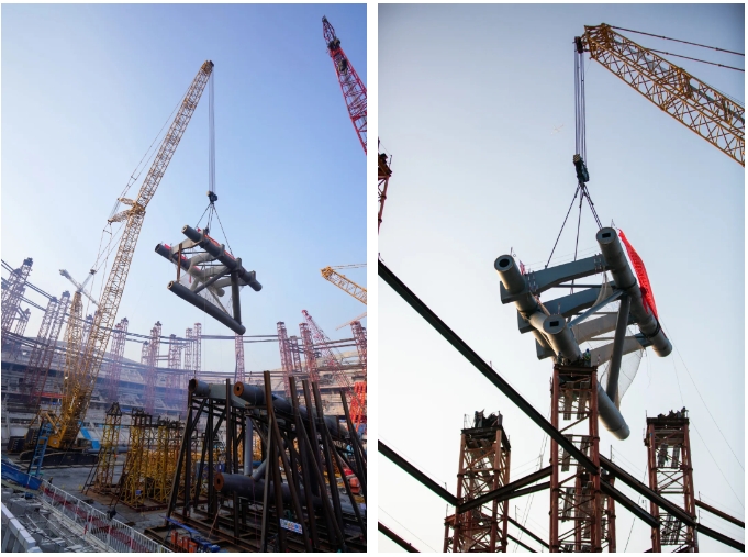 本次實(shí)施的首次吊裝段,位于內(nèi)環(huán)桁架,單元吊重達(dá)168噸,起吊縱深高達(dá)60余米。項(xiàng)目位于濟(jì)南新舊動(dòng)能轉(zhuǎn)換起步區(qū),建筑面積19.73萬平方米,建筑高度為60米,是山東省首個(gè)6萬座專業(yè)足球場(chǎng),可承辦國際、國內(nèi)重大體育賽事。同時(shí)也是國內(nèi)體育場(chǎng)館懸挑長度最大的工程,最大懸挑長度達(dá)到了45米,屋蓋鋼結(jié)構(gòu)由星形拱桁架、內(nèi)環(huán)桁架、外環(huán)桁架、單層網(wǎng)格及挑檐組成,總鋼量約3.1萬噸,靠36根排架柱支撐,形成巨型無柱大懸挑空間,在整體結(jié)構(gòu)中起到了承上啟下作用,下方排架柱與混凝土結(jié)構(gòu)相連,上方支撐索結(jié)構(gòu)、膜結(jié)構(gòu)。項(xiàng)目預(yù)計(jì)在2026年底竣工驗(yàn)收完成。