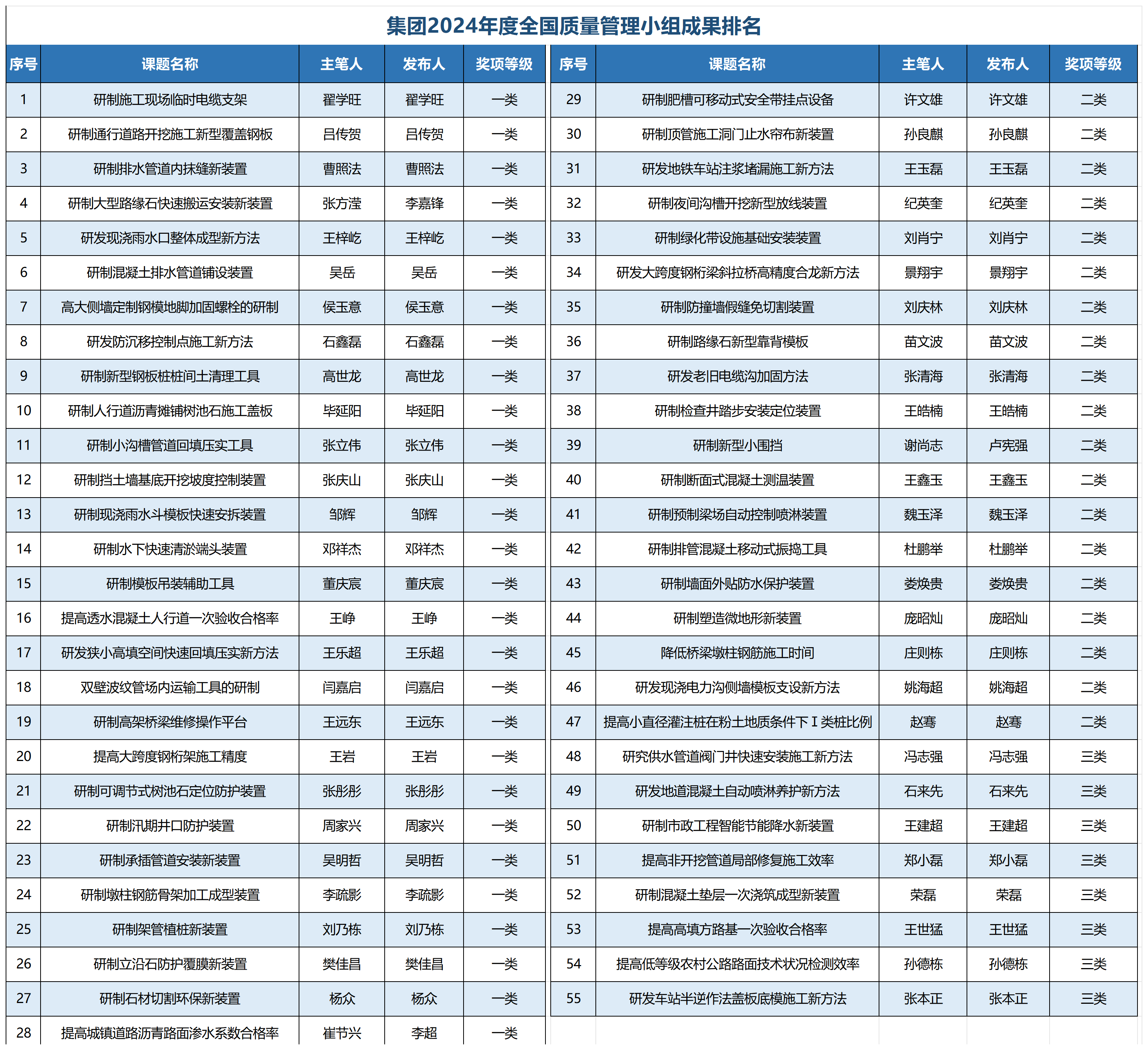 在本次市政工程建設(shè)質(zhì)量管理活動(dòng)中,城建集團(tuán)公司發(fā)布QC成果55項(xiàng),其中,一類成果28項(xiàng)、二類成果19項(xiàng)、三類成果8項(xiàng);發(fā)布質(zhì)量信得過班組成果14項(xiàng),其中,示范級班組8項(xiàng)、專業(yè)級班組5項(xiàng)、推進(jìn)級班組1項(xiàng)。