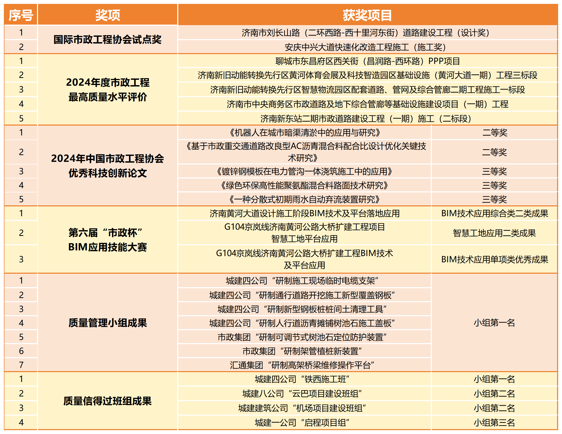 其中,濟(jì)南市劉長(zhǎng)山路(二環(huán)西路-西十里河?xùn)|街)道路建設(shè)工程等2項(xiàng)工程獲評(píng)“國(guó)際市政工程協(xié)會(huì)試點(diǎn)獎(jiǎng)”;聊城市東昌府區(qū)西關(guān)街(昌潤(rùn)路-西環(huán)路)PPP項(xiàng)目等5項(xiàng)工程獲評(píng)“2024年度市政工程最高質(zhì)量水平評(píng)價(jià)”;《機(jī)器人在城市暗渠清淤中的應(yīng)用與研究》等5篇論文獲評(píng)“中國(guó)市政工程協(xié)會(huì)科技創(chuàng)新論文”并入選《中國(guó)市政工程協(xié)會(huì)科技創(chuàng)新論文集》;城建集團(tuán)公司3項(xiàng)成果獲評(píng)第六屆“市政杯”BIM應(yīng)用技能大賽獎(jiǎng)項(xiàng),其中包括1項(xiàng)BIM技術(shù)應(yīng)用綜合類二類成果、1項(xiàng)智慧工地應(yīng)用二類成果、1項(xiàng)BIM技術(shù)應(yīng)用單項(xiàng)類優(yōu)秀成果;“研制施工現(xiàn)場(chǎng)臨時(shí)電纜支架”等7項(xiàng)質(zhì)量管理小組成果獲評(píng)小組一等獎(jiǎng)第一名;“云巴項(xiàng)目建設(shè)班組”等4項(xiàng)班組成果獲評(píng)全國(guó)市政工程“質(zhì)量信得過(guò)班組”示范級(jí)班組前三名。
