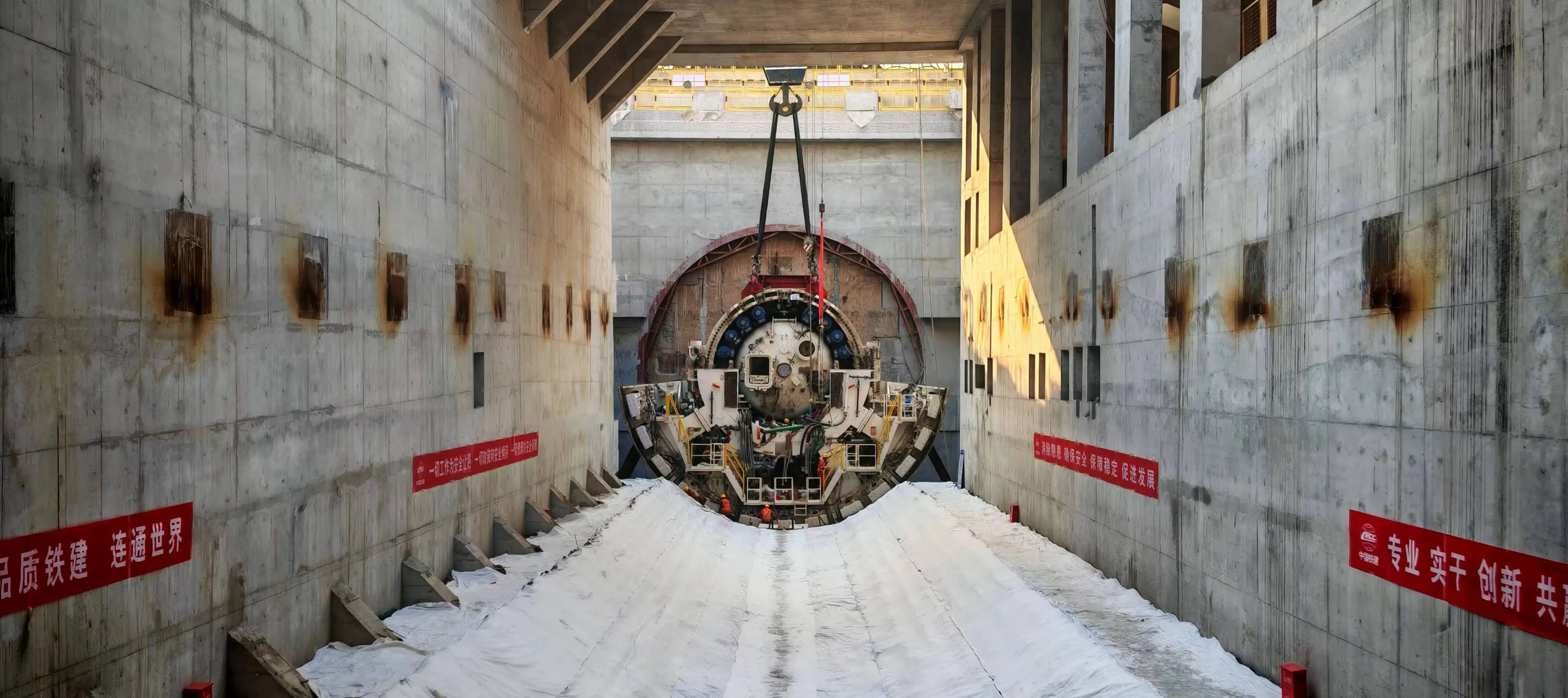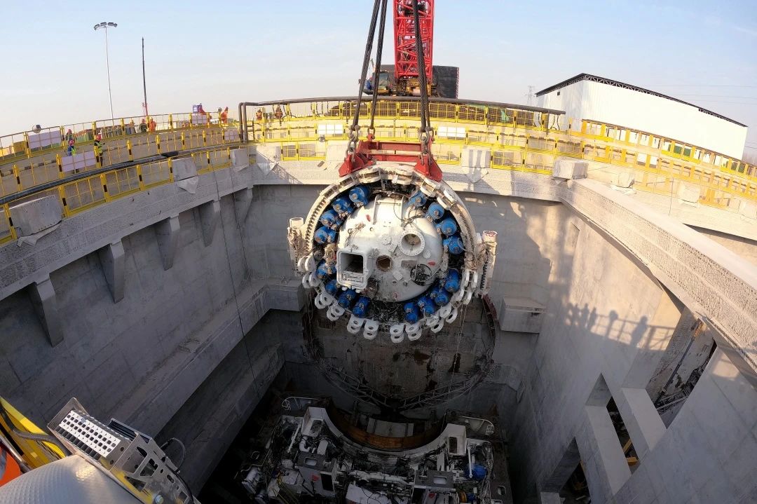 濟南市航天大道穿黃隧道(I期)全長約3.89公里,新建隧道約3.73公里,其中盾構段約3.25公里,采用雙管單層盾構形式,管片外徑14.5米,雙向六車道設計。目前,東岸圍護結構、土方開挖和主體結構施工完成,2月18日完成“啟航號”盾構機主驅動下井,盾構機總體組裝進度過半,配套設備組裝完成60%,進入了入地組裝的關鍵階段,接下來還將進行盾構機的刀盤下井吊裝工作,并全面開展盾構機始發(fā)前的整體安裝調試;南線盾構隧道始發(fā)基座、反力架基座施工,敞開段重載便道、接線道路復合地基加固和管線工程同步進行中;西岸圍護結構已完成,正在進行接收井基坑土方開挖及基坑砼支撐施工。