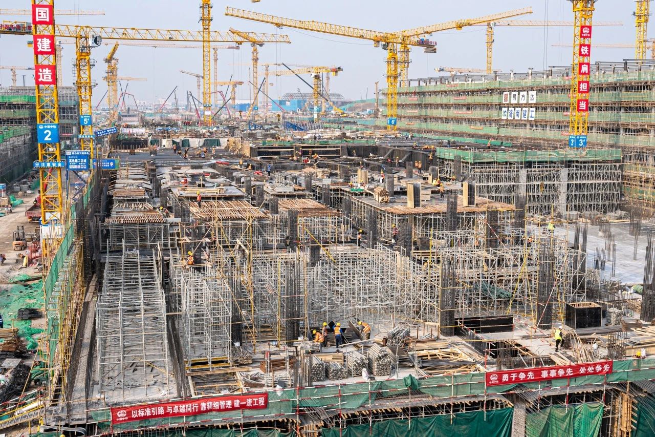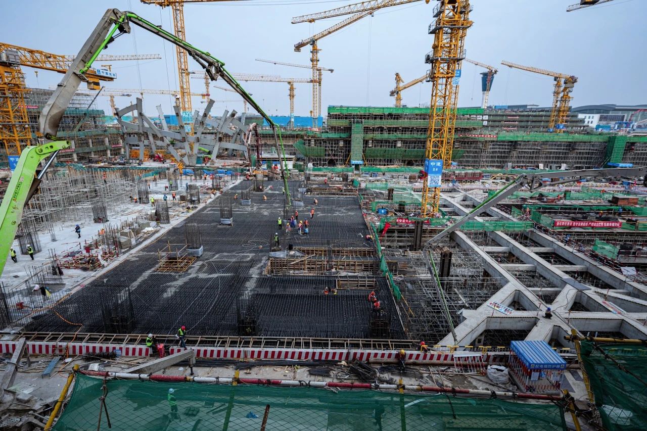在新建60萬㎡T2航站樓施工現(xiàn)場,項目A指廊正在進行樁基施工,B指廊正在進行地上結(jié)構(gòu)施工,C指廊已完成主體結(jié)構(gòu)封頂并正在進行鋼結(jié)構(gòu)網(wǎng)架吊裝。主樓三、四區(qū)正在進行地下結(jié)構(gòu)施工,主樓五區(qū)主體結(jié)構(gòu)已施工至地上二層。