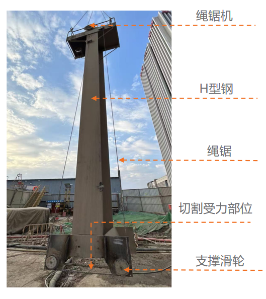 濟南軌道交通9號線一工區(qū)項目地連墻成槽前需將錨桿切除,因此錨桿切割效率成為制約圍護結(jié)構(gòu)施工的主要因素。項目部通過查閱資料并結(jié)合施工現(xiàn)場實際,研發(fā)一種適用于地連墻深槽中的錨桿切割設(shè)備。施工過程中,首先使用成槽機抓槽確定錨桿大致位置,使用測繩加強力磁鐵吸附錨桿精確確定位置;使用履帶吊吊起該設(shè)備,垂直下放到槽內(nèi),使下部鏈條放置在錨桿上,開啟開關(guān)進行切割。通過效益對比,使用該設(shè)備施工效率高(切割一根錨桿用時15分鐘)且不會造成塌孔,費用相對可節(jié)約70%,綜合效益顯著。