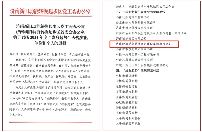 2月6日,濟(jì)南新舊動能轉(zhuǎn)換起步區(qū)召開2025年工作動員大會,通報(bào)表彰2024年度“成形起勢”表現(xiàn)突出的單位及個人。建設(shè)集團(tuán)所屬濟(jì)南城建動能轉(zhuǎn)換開發(fā)建設(shè)集團(tuán)有限公司,榮獲2024年度起步區(qū)“成形起勢”表現(xiàn)突出參建單位。